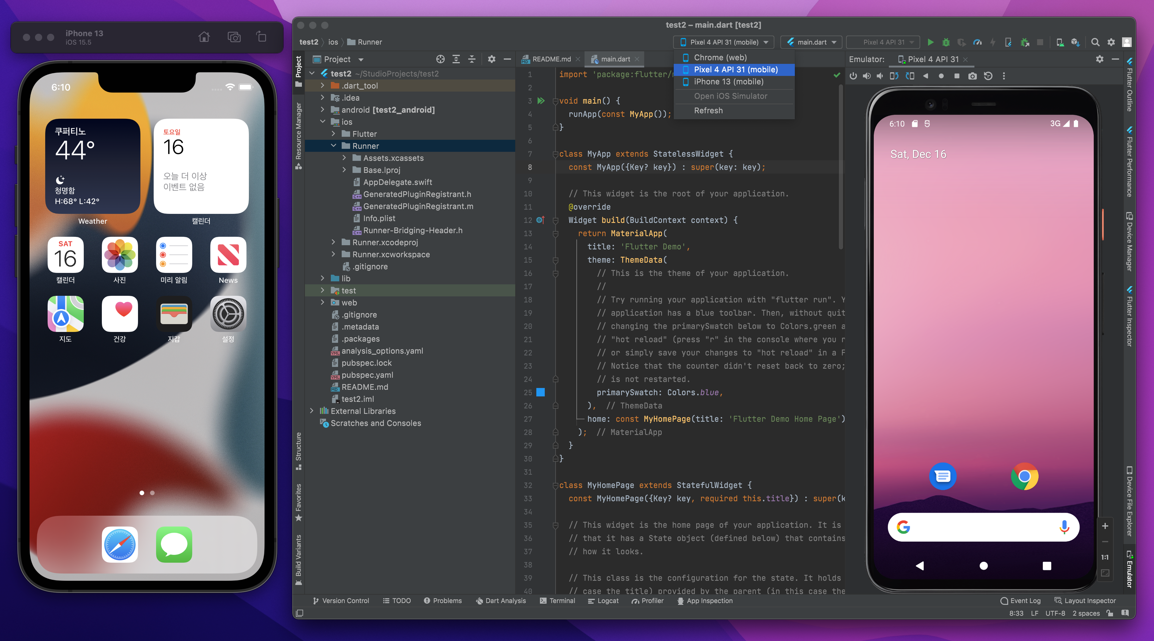 위를 다 설정하고 AndroidStudio에서 flutter 프로젝트를 생성하고 시뮬레이터를 돌려보면 잘 나온다