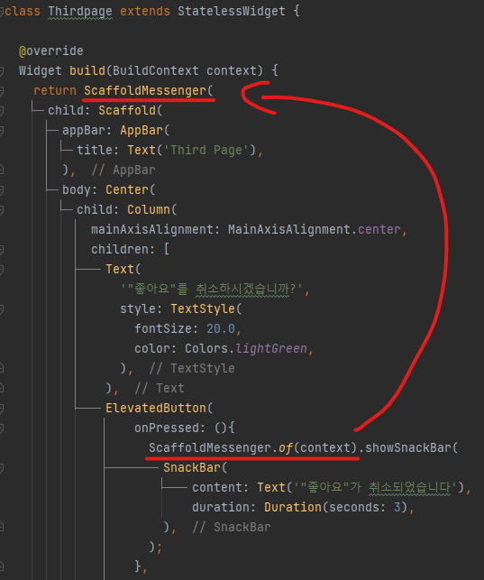 그래서 Scaffold 아래에 Builder 위젯을 사용하여 새로운 Context를 생성한후 ScaffoldMessenger 메소드에 전달해야함