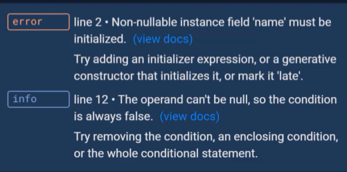 변수 초기화를 위해서 생성자를 만들어 주거나 'late' 키워드를 붙여준다.